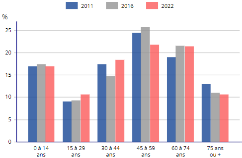 Population par grandes tranches d'âges 2022 % 2016 %